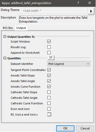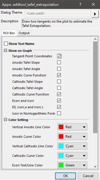 有两个标签页,第一个标签页 “ROI Box” 用于设置需要得到的数据,其中”Show on Graph”包括切点信息(Tangent Point Coordinates),阳极极Tafel斜率角度电流方程(Anodic Tafel Slope, Angle, Function),阴极极Tafel斜率角度电流方程(Cathodic Tafel Slope, Angle, Function),腐蚀电压电流(Icorr, Ecorr),以及非对数条件下的腐蚀电流(Icorr in Nonlogarithmic Form)。”Color Setting”中可以设置数据以及切线的颜色。