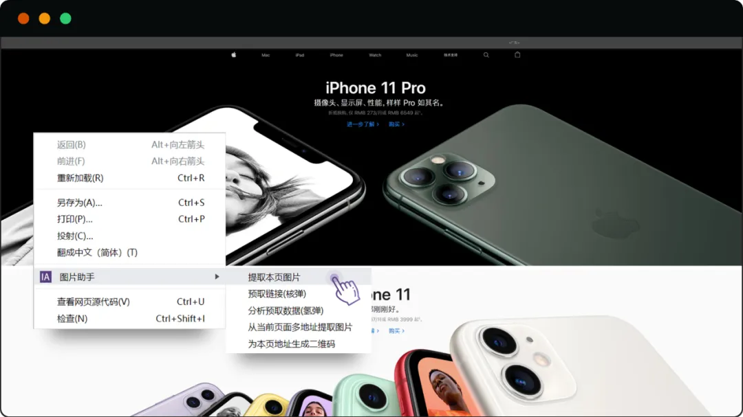而它的操作也很简单,安装插件后,打开目标网页,右键点击网页空白处,找到 图片助手,再点击 提取本页图片 即可。