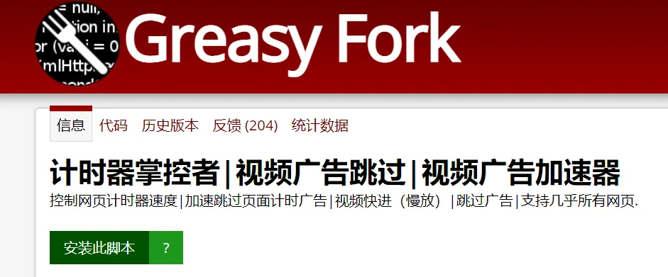 脚本名字叫做:计时器掌控者-视频广告跳过-视频广告加速器,主要提供各大网站视频的加速播放服务,很多连片头广告也能快进,确实有些意思。