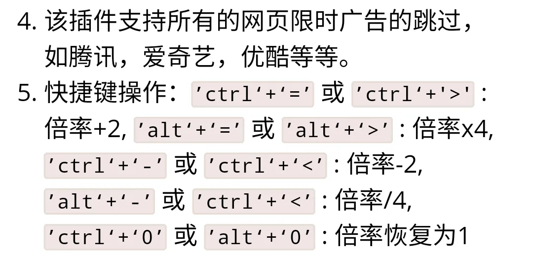 如下,开发者对脚本的功能介绍,脚本支持快捷键进行倍速操作,支持视频网站种类也是很多。