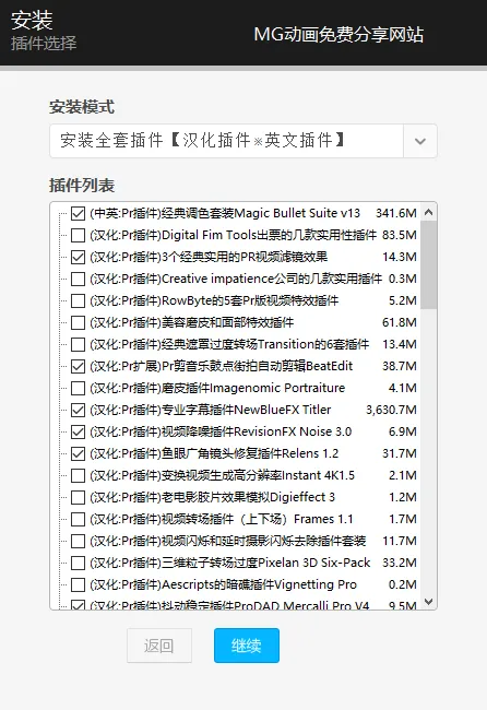 接着就是核心的插件选择部分,安装包提供了数十个别刚需且热门的插件,涵盖转场、调色、降噪、分屏、磨皮等各种插件: