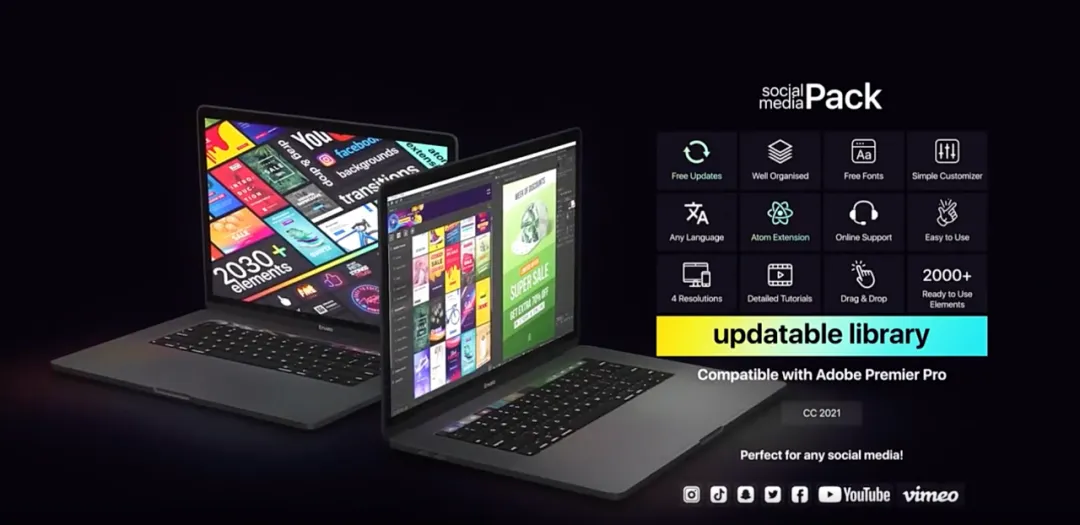 适用于PR软件的一套脚本预设。来自不同类别的2000多个专业社交媒体故事设计、元素和声音效果,可帮助您在专业水平上制作独特的视频。绝对适合任何竖屏项目。社交媒体包专为所有创作者设计。任何初学者或专业编辑、短视频博主、自由职业者等都可以使用。