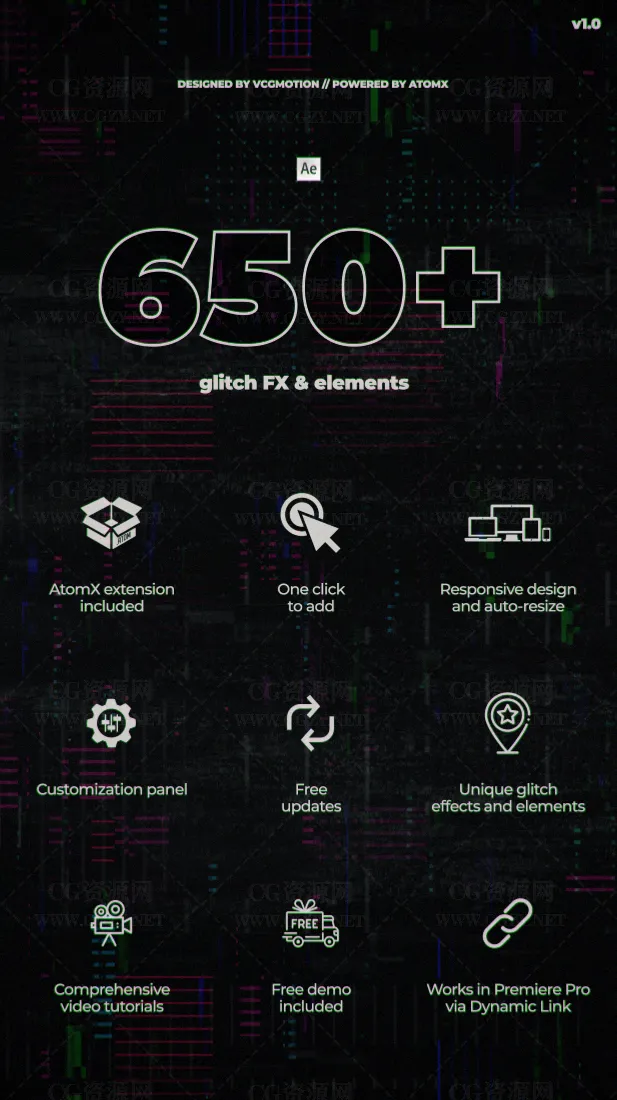 这套AE脚本提供了650+种预设:故障干扰、不良信号、文字LOGO标题、像素化、抖动拉伸、复古VHS、转场、音效等。