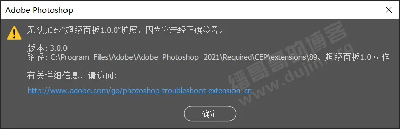 如果运行后提示无法加载“超级面板1.0.0”扩展,因为它未经正确签署。如下图所示: