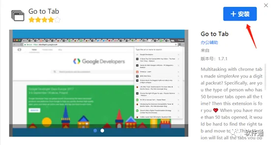 点击“Go To Tab”插件进行安装,可以看到该款插件的详细介绍,总结了插件的几个功能:列表显示标签页、标签页可搜索、快速关闭、导航标签页。