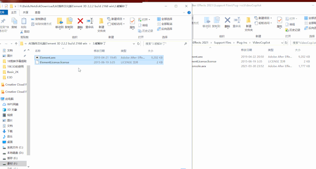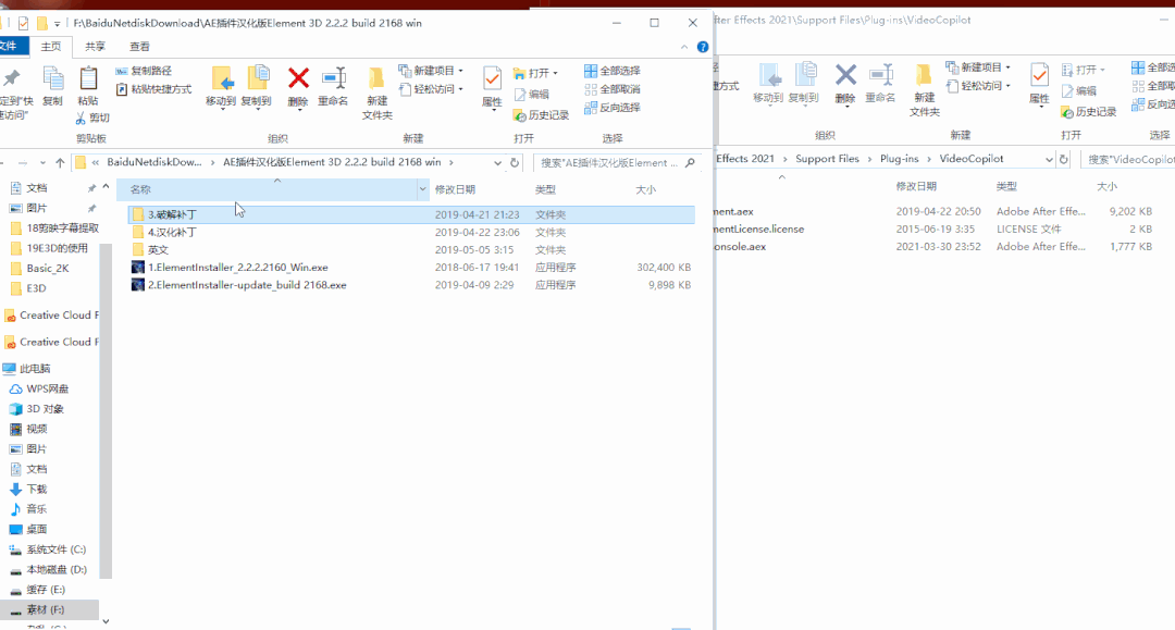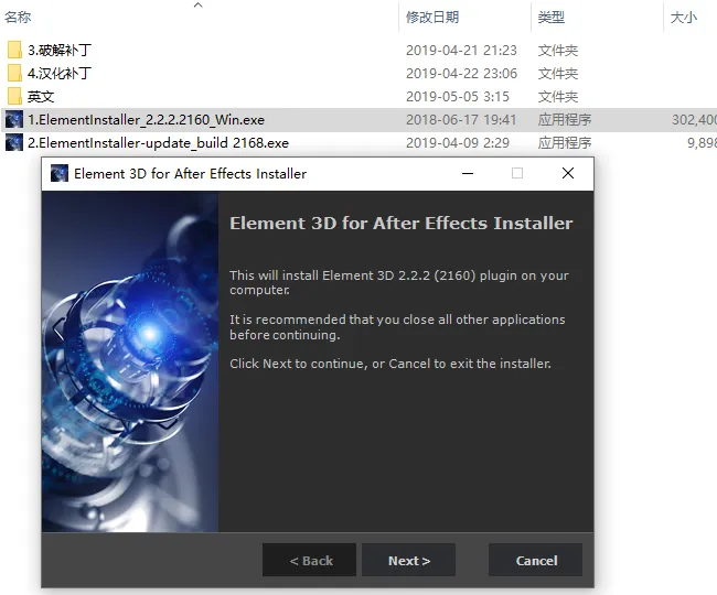 解压后,进到文件夹中,先安装上 Element,双击Element2.2.2.2160,这个文件安装。一直下一步就好,安装过程中记得关闭AE。