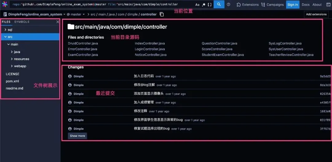 其他项目亦然,我们发现一个完整项目,代码是层次分明的,但是如果使用 GitHub 看一个项目源码时体验会非常差,查看不同的目录操作是这样的: