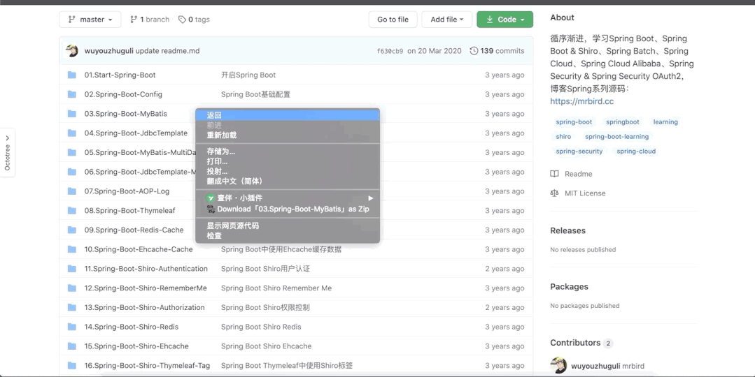 该插件就能帮助你轻松下载一个仓库中的部分代码,使用起来也很简单。安装插件后,找到你想下载的目录,在空白处点击鼠标右键,点击 Download 目录名 就可以下载了。
