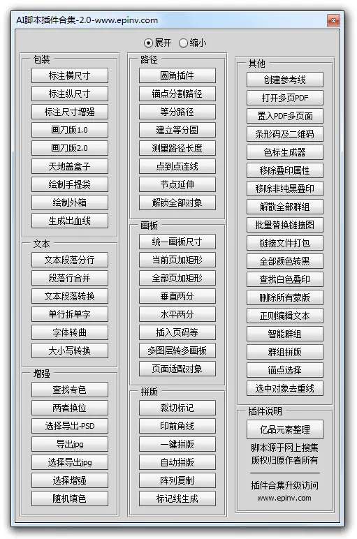 更新为AI脚本插件合集2.0版,除了更新部分插件以及增加几款新插件外,还支持AI CC 2019了。此AI插件包目前有62款ai脚本插件,已经整合成插件面板的形式,方便在AI中调用,后续有新脚本也会不断增加其中。