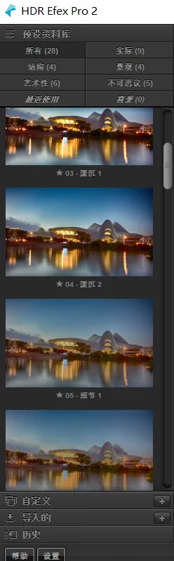 插件HDR Efex Pro(HDR成像滤镜)就是一款能够自动调整画面明暗的工具,我们将照片导入后就会发现,插件会自动匹配画面亮度,当然有时候还需要我们调节其中的一些参数,让照片呈现更合适的效果。