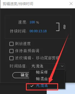 直接右击你的视频,选择【剪辑速度\持续时间】,改成30%左右的速度,最下面的【时间插值】选择【光流法】
