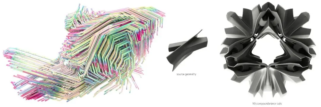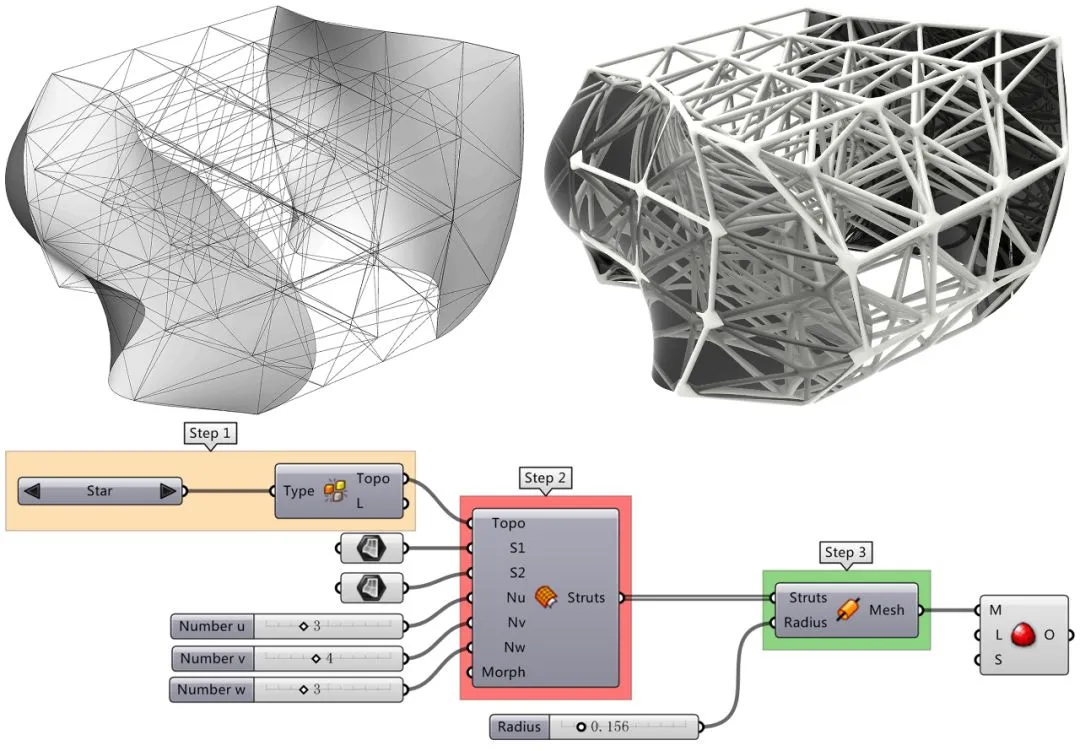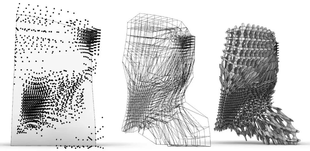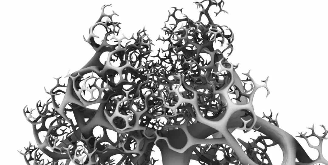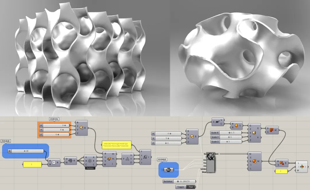 主要用于结构分析与优化,可对框架结构与壳结构进行快速的线性与弹性分析。Millipede插件也提供了拓扑优化与有限元分析的功能,其流程主要包含四部分:荷载与边界条件定义、集合定义信息、解算程序、得到结果。极小曲面的形体可通过IsoSurface算法进行模拟,其V值可直接由极小曲面方程式提供,由于极小曲面公式的发现属于数学领域,设计行业可直接使用现有的公式。