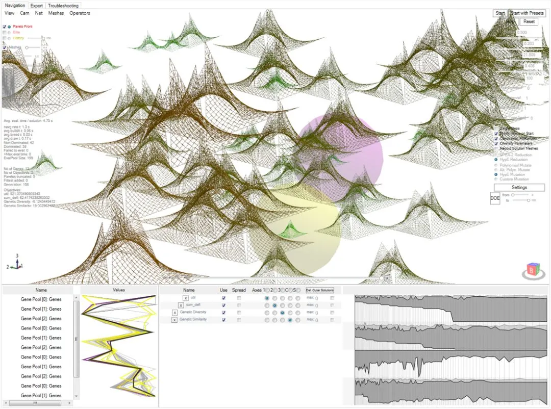 根据遗传算法来优化和筛选结果,相比于GH自带的遗传算法运算器,该插件可同时优化多个目标参数,从而在每个目标的极端之间产生一系列优化的权衡解决方案,效率更高。