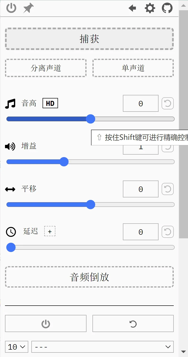 ③声音设置,功能非常多,包括声音捕获、音高变换、音量提升、EQ效果、音频倒放、音频延迟等等。