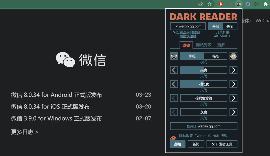 Dark Reader可以调整页面亮度、对比度、字体以及棕褐色滤镜,插件完全免费,并且是开源的,放心使用。
