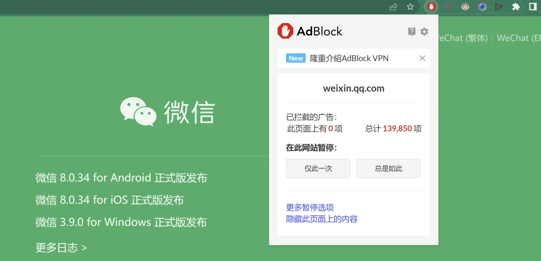AdBlock 是一款非常流行的广告拦截工具,支持去除网页贴片广告、弹窗广告和视频播放广告。
