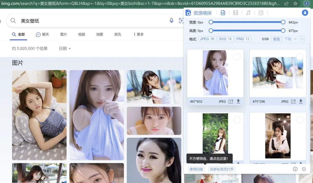 对于网页上喜欢的壁纸图片、音视频,只需要点击AIX的图标,一会儿就能嗅探出来,然后根据需要进行筛选,然后点击下载按钮就能轻松保存到本地。
