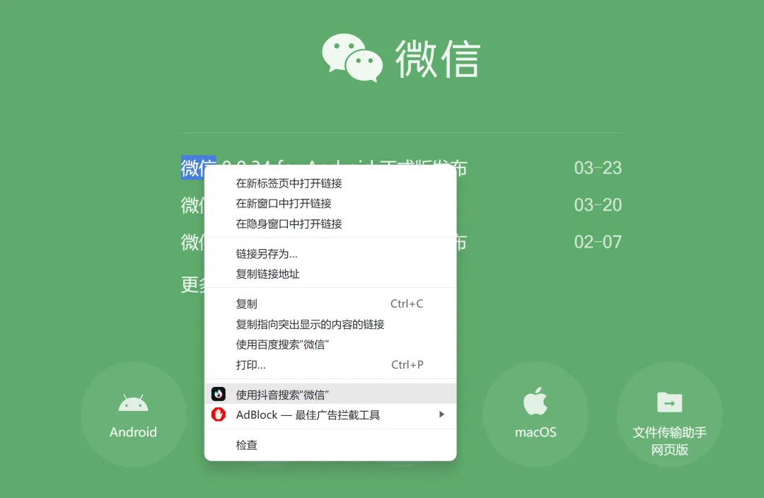 4、右键搜索,在任意网页选中文本,点击右键,选择“使用抖音搜索所选文本”,自动打开抖音进行搜索。