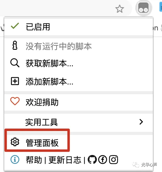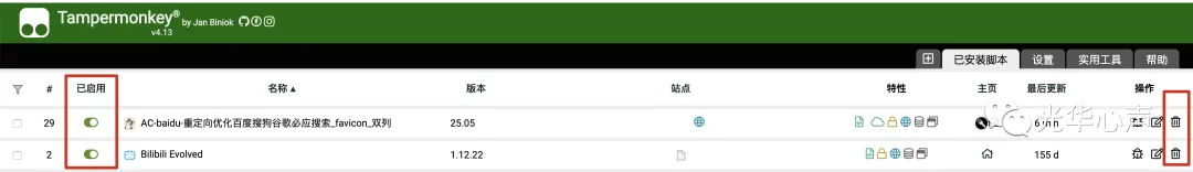 管理面板,可以看到所有安装的油猴插件,通常用到的是启用和删除,其他功能自行研究
