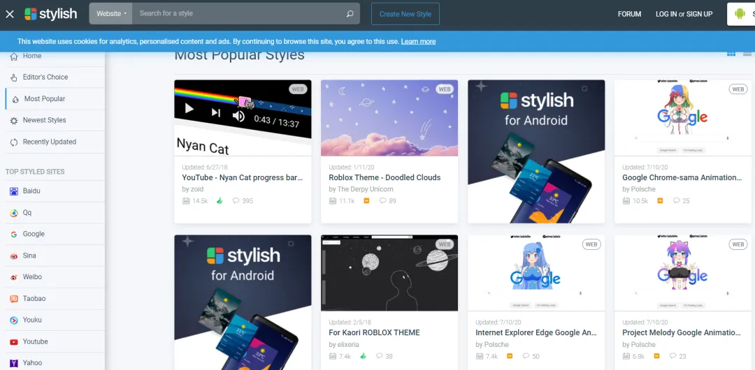 顺便说一句,由于插件是开源的,一些大佬们会把自己写的样式分享到样式库里,很多网页都有不错的样式供使用。