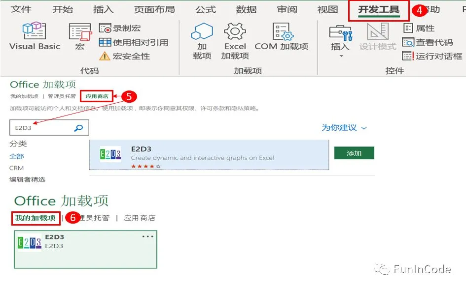 选择应用商店>搜索E2D3>添加,完成后会在我的加载项中看到新插件E2D3