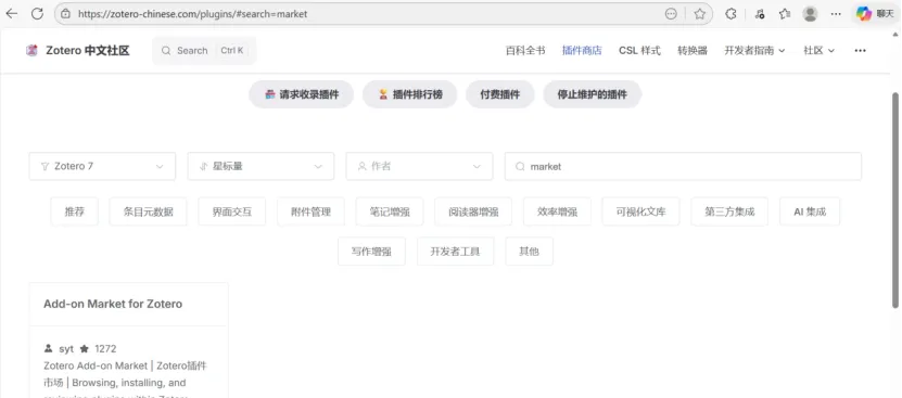 首先下载插件Add-on Market for Zotero,此插件类似于一个插件商店(其他插件要依赖这个)。