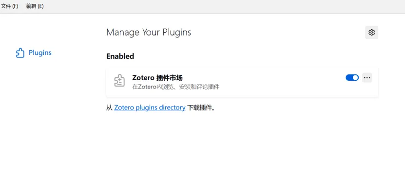 打开Zotero的工具->插件,将刚才下载的文件拖进去,随后您可以看到页面显示Zotero插件市场。