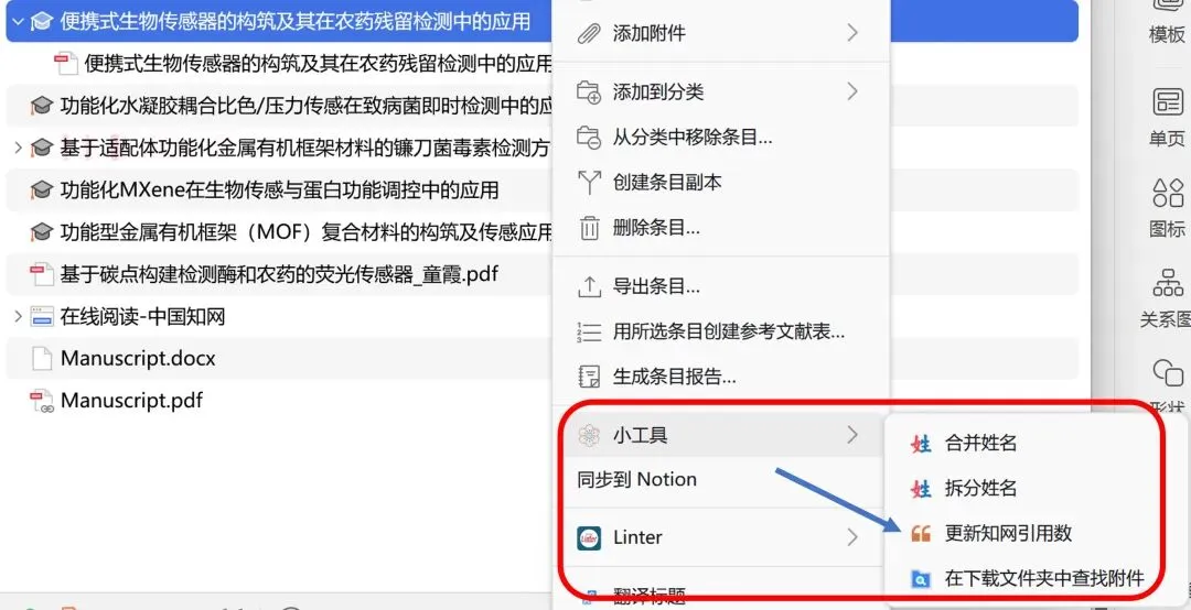 操作:在Zotero中右键点击该文献条目,选择 “抓取知网元数据”。