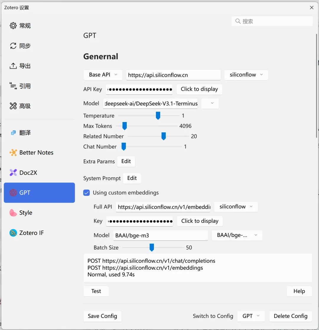 配置比较简单,在编辑的配置里,可以对GPT进行配置,可以自己找api源,也可以找免费的api,进行配置。这里使用的硅基流动的api,对话模型使用的是Deepseek-V3.1,下面那个模型是嵌入模型,使用BAAI/bge-m3这个模型,是免费的。保存好配置可以进行测试,测试没问题就可以使用了。