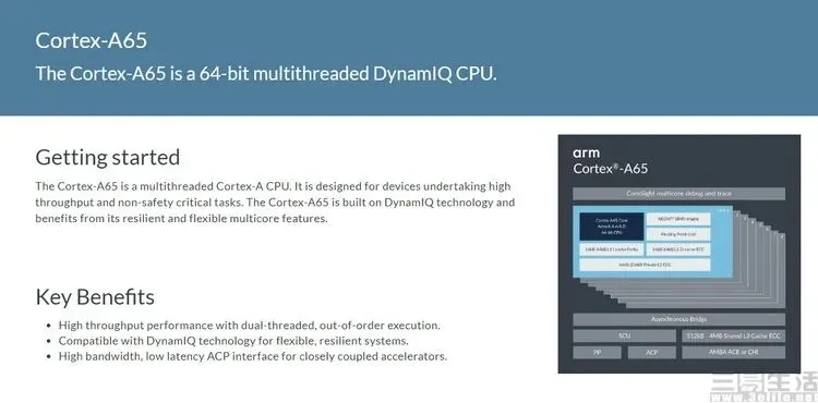 严格意义上来说,Cortex-A65并不是一款很新的架构,因为它脱胎自2018年底发布的Cortex-A65AE,后者是ARM专为车载计算机市场研发的一款中等功耗水准的小核心架构。但与一般的A53和A55小核比起来,Cortex-A65AE以及之后的Cortex-A65又有三大不同。第一是它注重的并非单纯的高能效比,而是在相对(A76这种大核)低功耗的前提下,提供尽可能高的计算吞吐量;第二是它采用了ARM史上首个超线程CPU设计,每核心拥有两个线程;第三就是在“高吞吐量”的指导思想下,Cortex-A65家族完全放弃了对32位指令集的兼容性,成为了一款仅支持64位代码的ARM处理器。