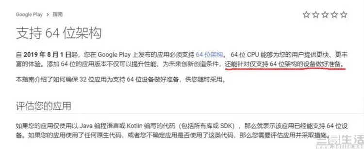 当时我们曾指出,Android的64位应用不能及时实现替代的主要原因,其实谷歌对于开发者的“纵容”要负很大一部分责任。因为按照当时的官方开发指南来看,虽然其在2019年8月1日(这已经很晚了)起,就已经明确规定了所有在官方商店上架的应用必须支持64位,但却没有禁止保留对32位的兼容。这直接意味着很多应用里的32位代码并没有作废,进而导致在谷歌难以直接整顿的一些应用市场,纯32位应用依然大行其道,不仅严重制约了手机的流畅度,更造成手机性能及电量在一定程度上的浪费。