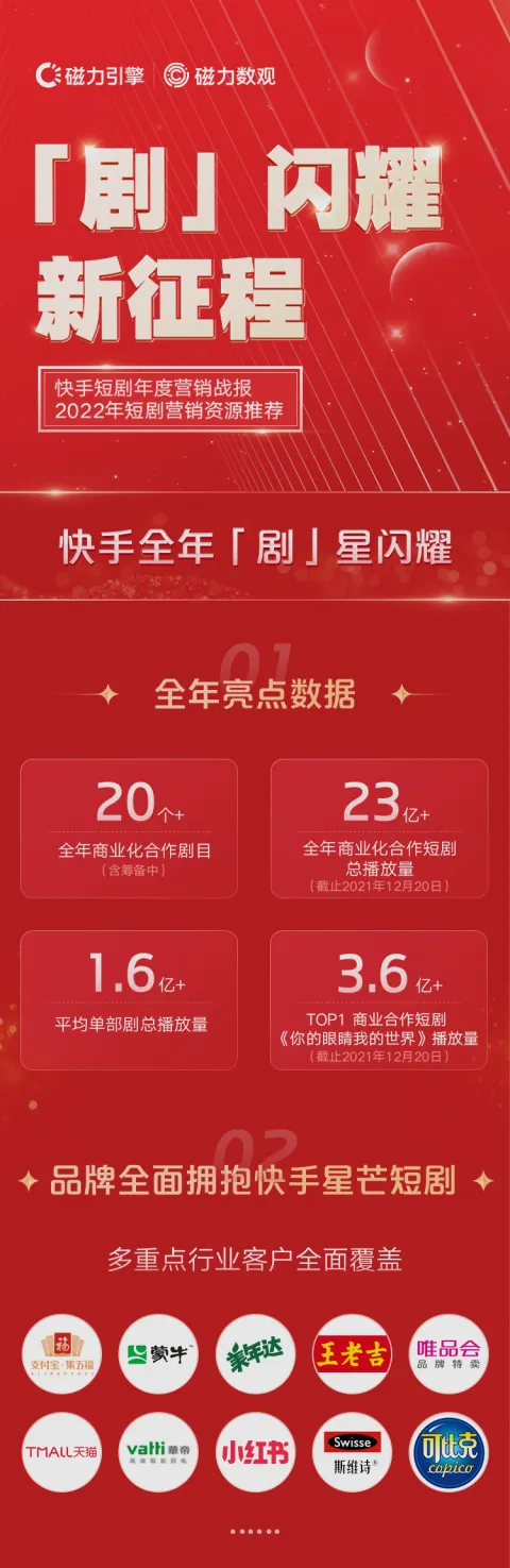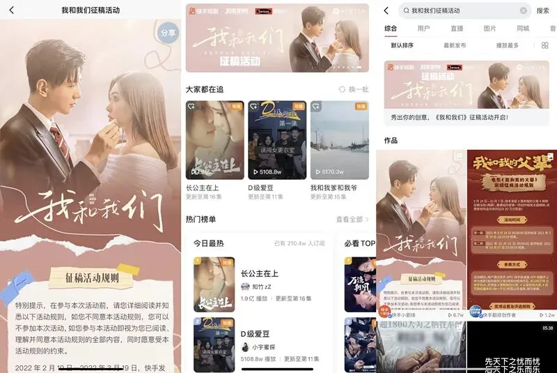 另一部分是微短剧,以快手等短视频平台为主导,常规性推介2-3分钟以内的竖屏微短剧。透过网络短剧拍摄,网络达人增加了一重演员身份,更容易通过流量分账、品牌招商、电商直播等实现达人变现,同时也为微短剧带来有效流量。