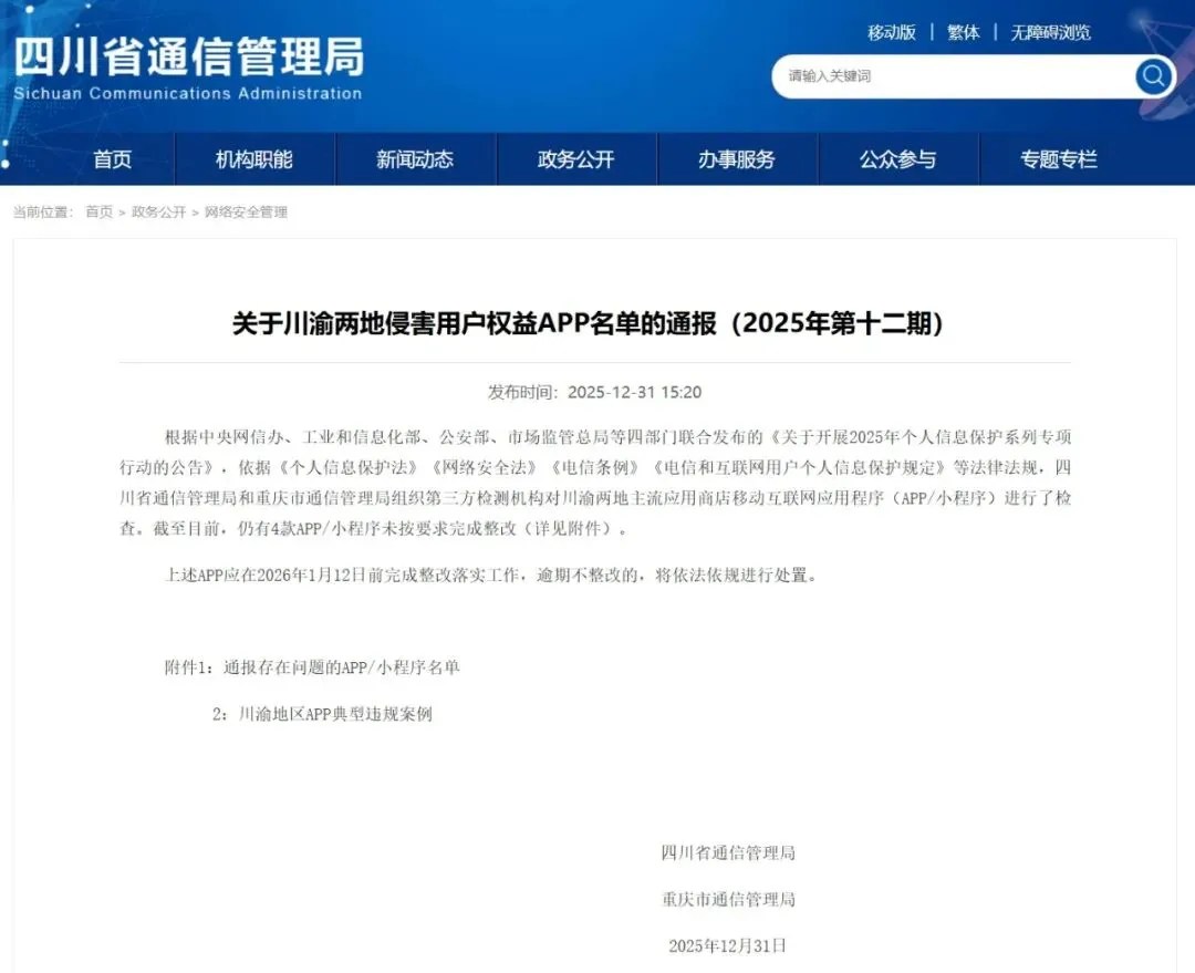 根据中央网信办、工业和信息化部、公安部、市场监管总局等四部门联合发布的《关于开展2025年个人信息保护系列专项行动的公告》,依据《个人信息保护法》《网络安全法》《电信条例》《电信和互联网用户个人信息保护规定》等法律法规,四川省通信管理局和重庆市通信管理局组织第三方检测机构对川渝两地主流应用商店移动互联网应用程序(APP/小程序)进行了检查。截至目前,仍有4款APP/小程序未按要求完成整改(详见附件)。
