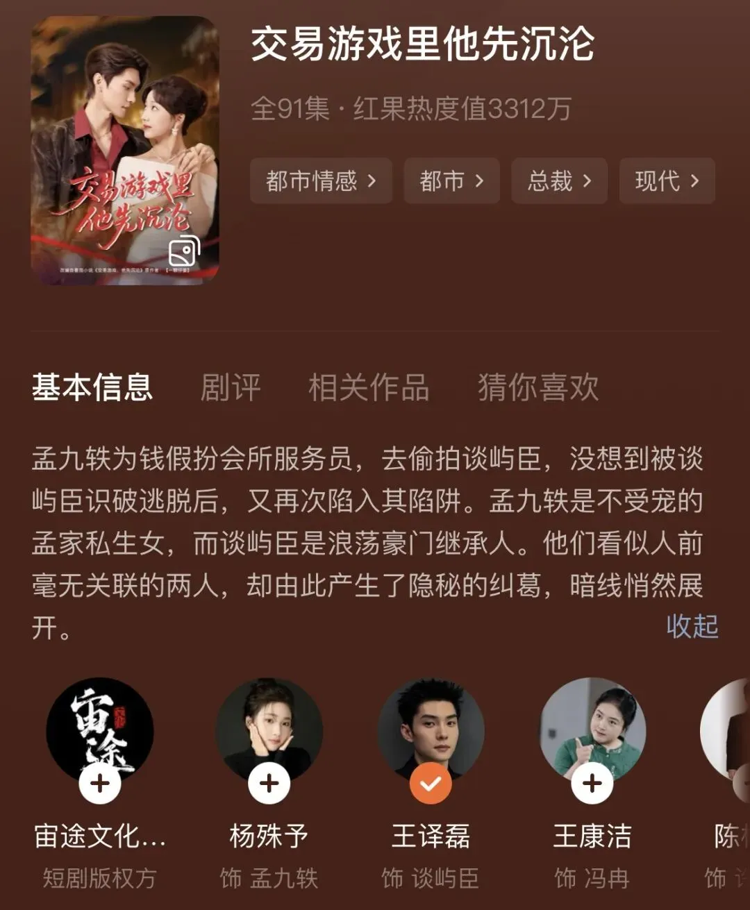 🤩男女主都是有脑子的聪明人,刚开始相互利用,你来我往拉扯,拉扯剧情最好看。腹黑男主,小白兔狐狸女主,两个人各有800个心眼子,没有特别狗血的剧情。后来男主沦陷了,被小白兔女主训成狗狗了。特别上头,过瘾,王译磊的脸很适合这种带感的角色。