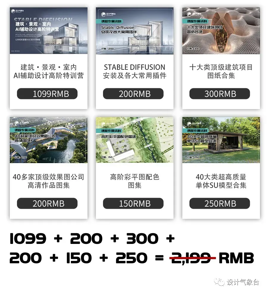 目前市面上的Stable Diffusion相关课程,一般都在四位数以上,而且教的内容基本都是人物画像或者场景CG,专门教建筑、景观或室内的几乎没有。