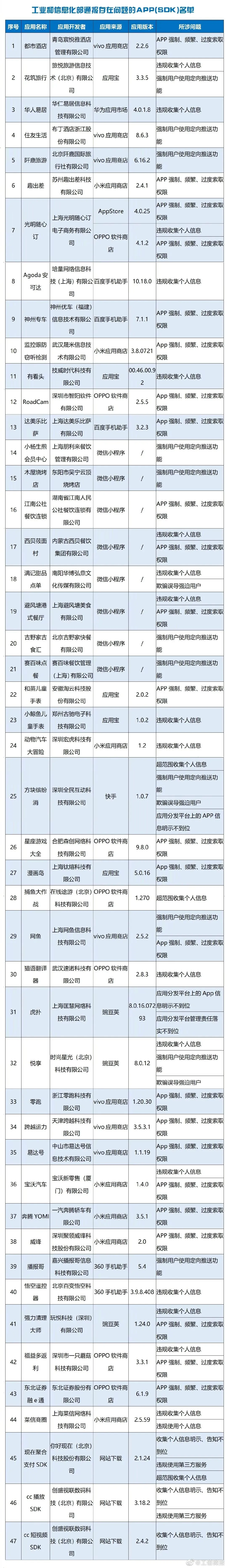 依据相关法律法规,工信部组织第三方检测机构对群众关注的酒店餐饮类、未成年人应用类等APP及SDK进行检查,对发现存在侵害用户权益行为的共227款APP和SDK提出整改要求。截至目前,尚有47款APP和SDK未按要求完成整改。工信部对这些APP和SDK进行通报,要求在9月5日前完成整改落实工作。逾期不整改的,工信部将依法依规组织开展相关处置工作。