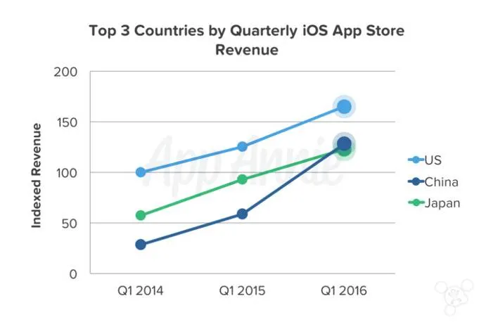 今年第一季度已经过去了,很多相关的数据都开始渐渐浮出水面,在 2016 年第一季度里,我国 iOS App Store 市场终于迎来了一个里程碑,在收入方面,我们总算首次超过了日本,不过,我国 iOS App Store 收入和位于第一的美国还有一段距离。