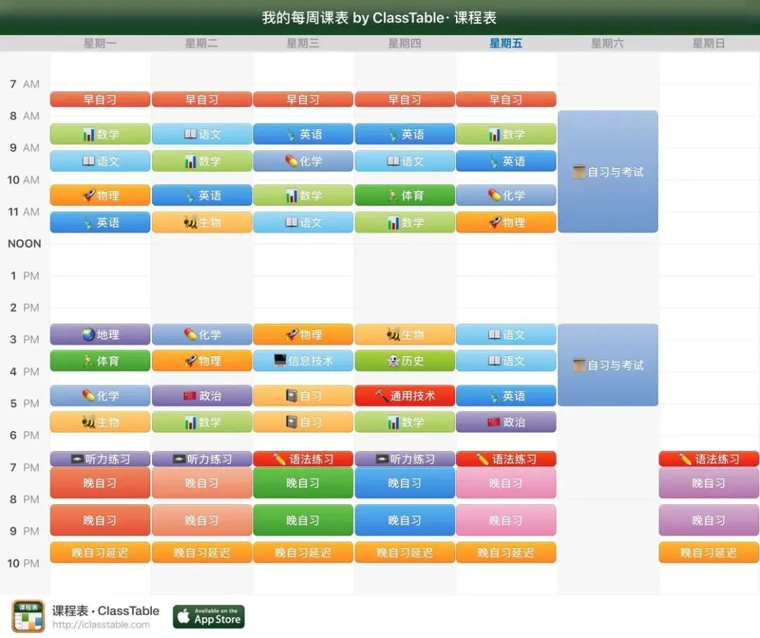 不过现在想想,当初的自己真是中二啊 —— 明明高中课表固定、教室也不变,我还是把课程表导出了一张图片、彩色打印出来还封了塑,贴在自己课桌的一角,仿佛这样心里才踏实。