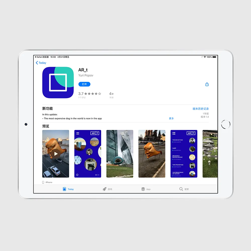 2010 年代的「赛博朋克」梦想还是一直有的。VR 和 AR 这两个在各种科幻小说电影中出现过无数次的概念在这个年代成为了(至少是初级阶段的)现实。利用手中的 iOS 设备和 App Store 中的各类 AR 应用,体验现实和电子屏幕像素的交织。AR\_t 是一款将现代艺术元素制作成 3D 模型并且利用 ARKit 呈现在现实空间中的 app,效果惊艳并且出其不意。