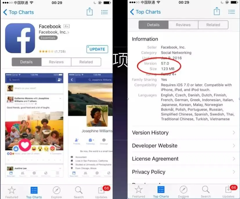 从上图可以看到,在欧美板块,Facebook一直处于领先位置。首先问大家一个问题,猜猜Facebook有多少工程师?几百人、或者几千人?这个App实际上非常大,有123MB,用户基本上不敢在运营商网络里面下载。当时我们的App也是开发软件最多的。很多工程师其实做得并不是特别好,但是又把很多代码加进去。这是一个比较负面的例子,因此大家不要觉得Facebook太牛逼。