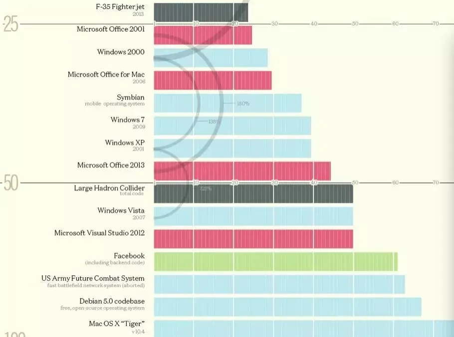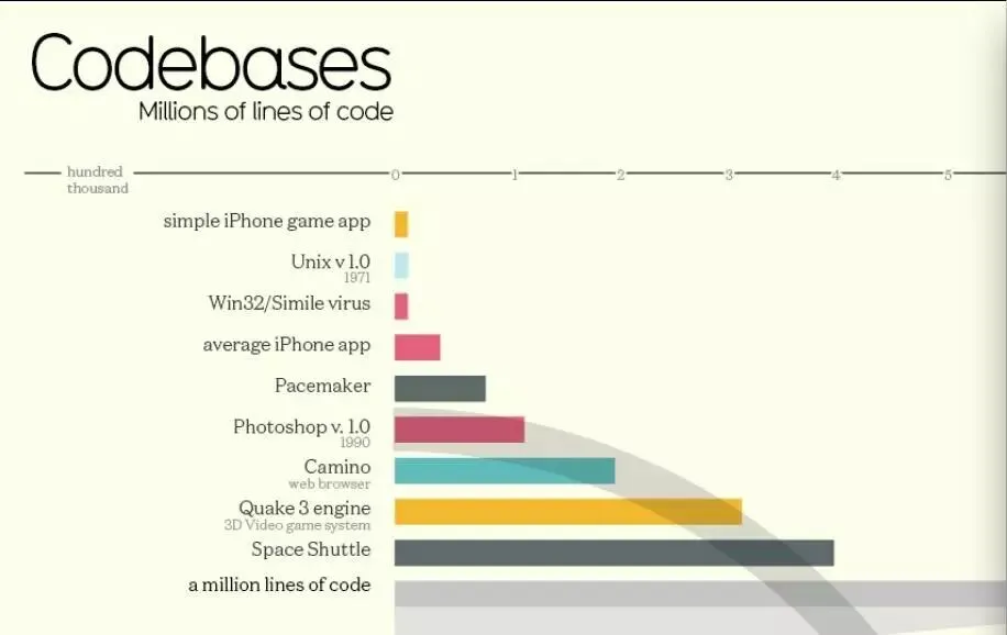 Facebook App有123MB,各种App加在一起,是1190万的规模。Facebook整个代码库,估计是在6千万行代码左右。可以看到,Mac OS Tiger 操作系统的复杂度远大于这个。