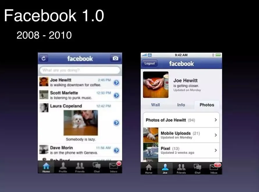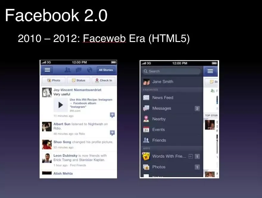 首先回顾一下Facebook这10年发生了什么。十年前,iPhone 4还没有诞生,换成HTML5之后,那时的名字叫Faceweb,原生就是一个壳,用网页来取代原生做了一套App。
