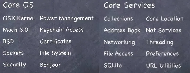 Foundation是属于Objective-C的API,Core Fundation是属于C的API。另外Core servieces还提供了如Security(用来处理认证,密码管理,安全性管理等), Core Location, SQLite和Address Book等功能。
