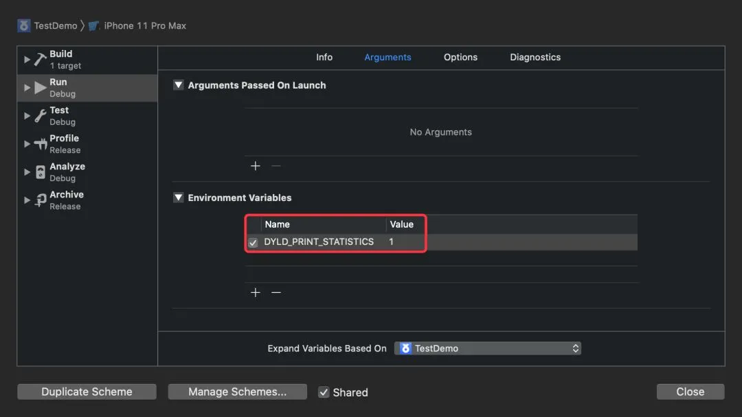 我们可以在 Xcode 中配置环境变量 DYLD_PRINT_STATISTICS 为 1(Edit Scheme → Run → Arguments → Environment Variables → +)。