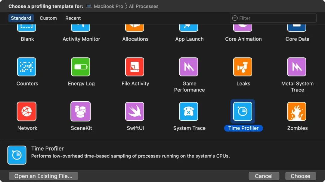 打开方式为:Xcode → Open Developer Tool → Instruments → Time Profiler。