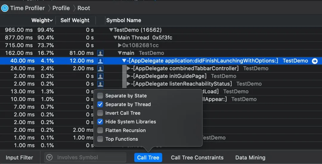 为了方面查看应用程序中实际代码的执行耗时和代码路径实际所在的位置,可以勾选上 Call Tree 中的 Separate Thread 和 Hide System Libraries。