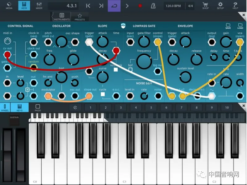 由 Bram Bros 所开发的 Ripplemaker,带有非常强烈的西岸 Buchla 模块合成器风格,而这款 app 中的模块共包含了 Complex oscillator、Lowpass gate、Frequency modulation、Mathematical utilities 以及Slope generator,相对于东岸的键盘合成器演奏方式,也都是非常独特且有趣的声音合成方式。对于声音设计或是实验新类型的声音都是非常好用的工具。