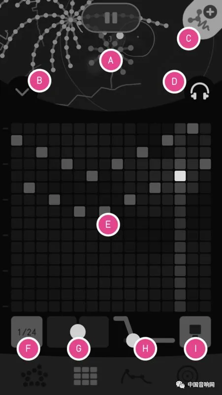 *Sequencer:这是一个 16*16 方格的画面,可以增加你的音符并且调整音高,随着你的调整,你的神经细胞也会改变形状和移动的方式。在左下方你可以改变你的序列机速度从 1/1 到 1/64,其余还可以设定的包含了 Swing、Glide 和 Voice Mode。