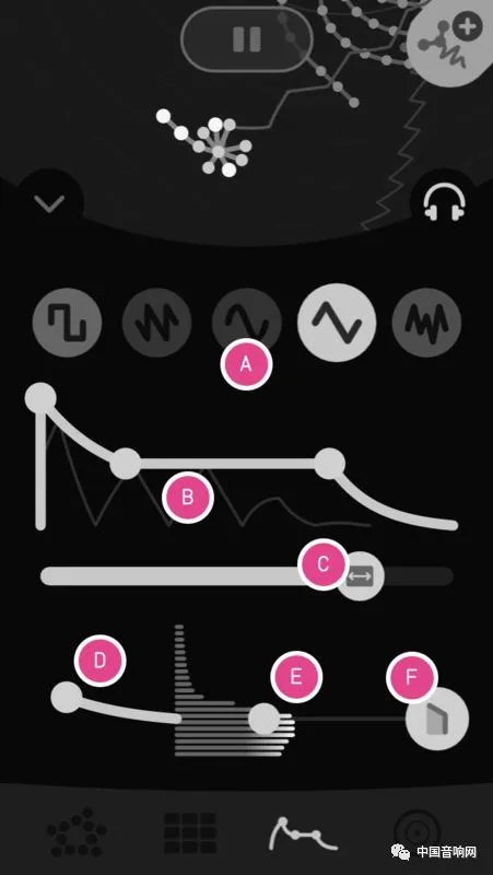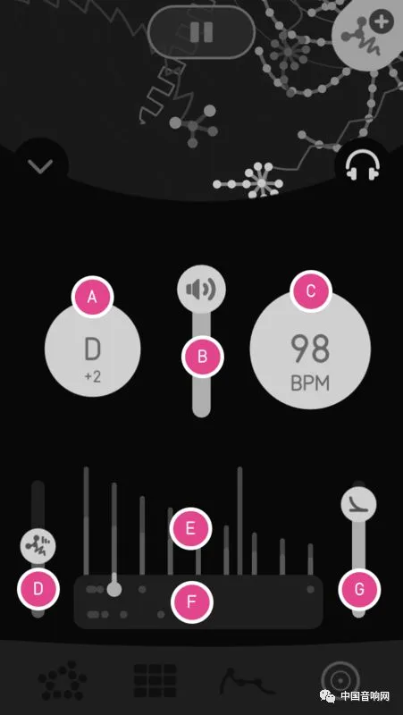 当你点进一个神经细胞之后,上方会有一个耳机的图案,可以关闭或是打开其他细胞的声音,然后下方会有四个子选项,包含了 tones、sequencer、envelopes 和 global。