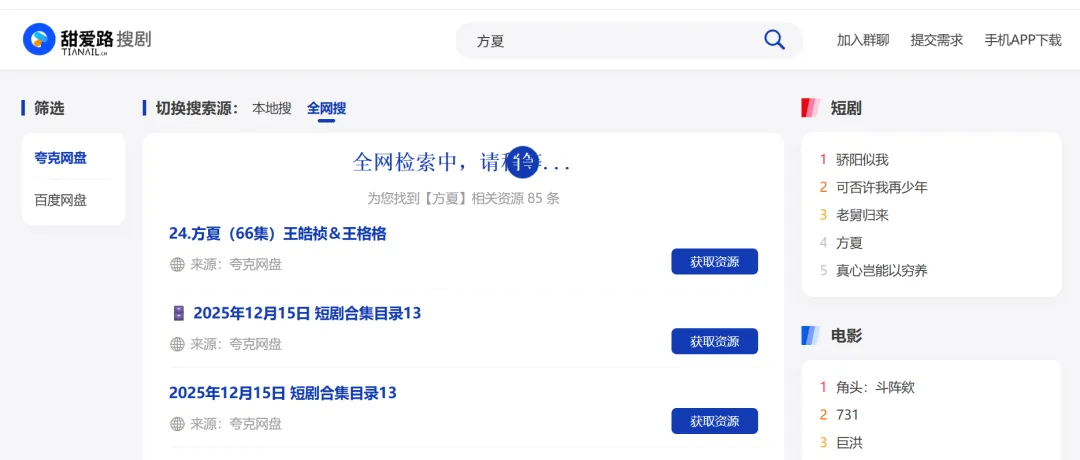 网址:https://www.tianail.cn简介:全网最新短剧收集与分享,免费,资源多可搜索,但是需要保存到夸克网盘才能观看